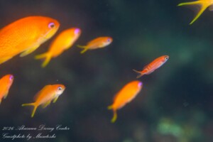 キンギョハナダイ(オス・メス・yg)、サクラダイ(オス・メス・yg)、スジハナダイ(メス・yg)、ナガハナダイ(オス・メス・yg)、アカオビハナダイ(オス・メス・yg)、コウリンハナダイ(オス・メス・yg)、ミナミハナダイ(オス・メス・yg)、アカボシハナゴイ(オス・メス・yg)、アサヒハナゴイ(メス・yg)、ベニハナダイyg、ルリハタyg、ツキベラyg、ヤマシロベラ、ヤマブキベラ、キツネベラ、キツネダイ、オグロベラ、オキナワベニハゼ、ベンケイハゼ、フトスジイレズミハゼ、アカイソハゼ、コバンハゼ、クダゴンベいっぱい、キリンゴンベ、サラサゴンベ、オナガスズメダイ、クマノミ、レンテンヤッコ、トサヤッコ(オス・メス)、ヤイトヤッコ、アオハナテンジクダイ、イサキ群れ、フエダイ群れ、アカスジカクレエビ、イソバナカクレエビ、ハクセンアカホシカクレエビ、テヅルモヅルエビ、トウシマコケギンポ、ニラミギンポ、テングダイいっぱい、カメ、ハチジョウタツetc…