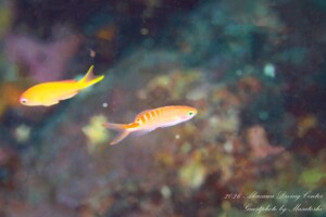 キンギョハナダイ(オス・メス・yg)、サクラダイ(オス・メス・yg)、スジハナダイ(メス・yg)、ナガハナダイ(オス・メス・yg)、アカオビハナダイ(オス・メス・yg)、コウリンハナダイ(オス・メス・yg)、ミナミハナダイ(オス・メス・yg)、アカボシハナゴイ(オス・メス・yg)、アサヒハナゴイ(メス・yg)、ベニハナダイyg、ルリハタyg、ツキベラyg、ヤマシロベラ、ヤマブキベラ、キツネベラ、キツネダイ、オグロベラ、オキナワベニハゼ、ベンケイハゼ、フトスジイレズミハゼ、アカイソハゼ、コバンハゼ、クダゴンベいっぱい、キリンゴンベ、サラサゴンベ、オナガスズメダイ、クマノミ、レンテンヤッコ、トサヤッコ(オス・メス)、ヤイトヤッコ、アオハナテンジクダイ、イサキ群れ、フエダイ群れ、アカスジカクレエビ、イソバナカクレエビ、ハクセンアカホシカクレエビ、テヅルモヅルエビ、トウシマコケギンポ、ニラミギンポ、テングダイいっぱい、カメ、ハチジョウタツetc…