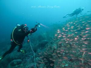 三角岩ではスズメダイやホウライヒメジ、キンギョハナダイの群れ